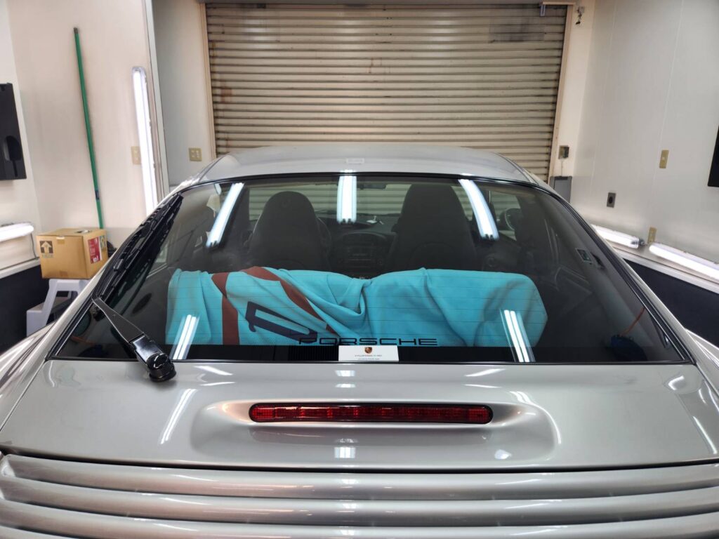 まずはリアガラス3面の断熱スモークフィルム施工から!